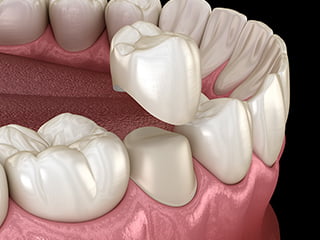 奥歯(臼歯)の全体にわたる虫歯や歯髄治療後の歯に対して行う治療で、歯を大きく削った際に行う治療法です。歯茎から上に出ている部分を覆うように、型を取って作り出したクラウン(人工の歯)を被せて接着することで、噛み合わせを再現します。